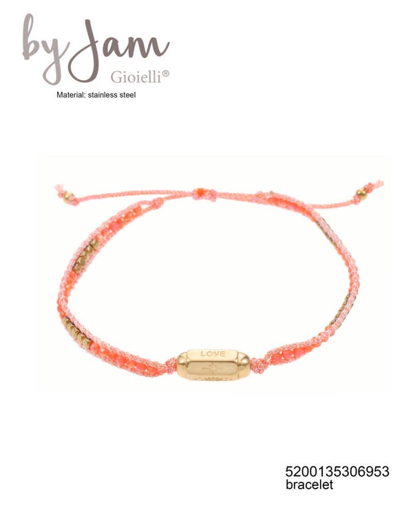 Trendy armband in zalm-oranje kleurige uitvoering. De armband heeft gouden accenten en een trekkoord sluiting.