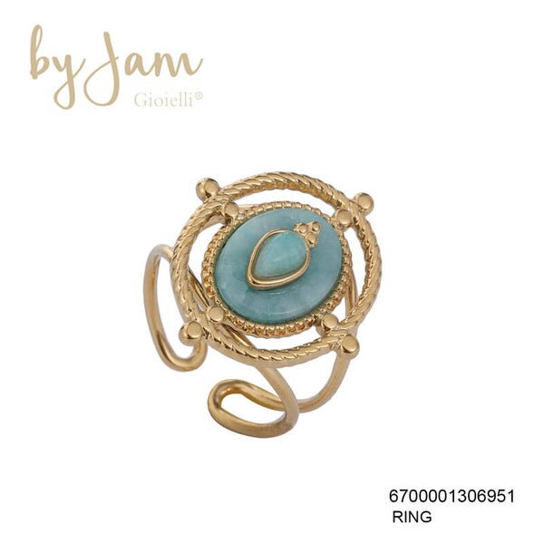 Uitgevoerd in goudkleur en met 2 turquoise stenen op elkaar.