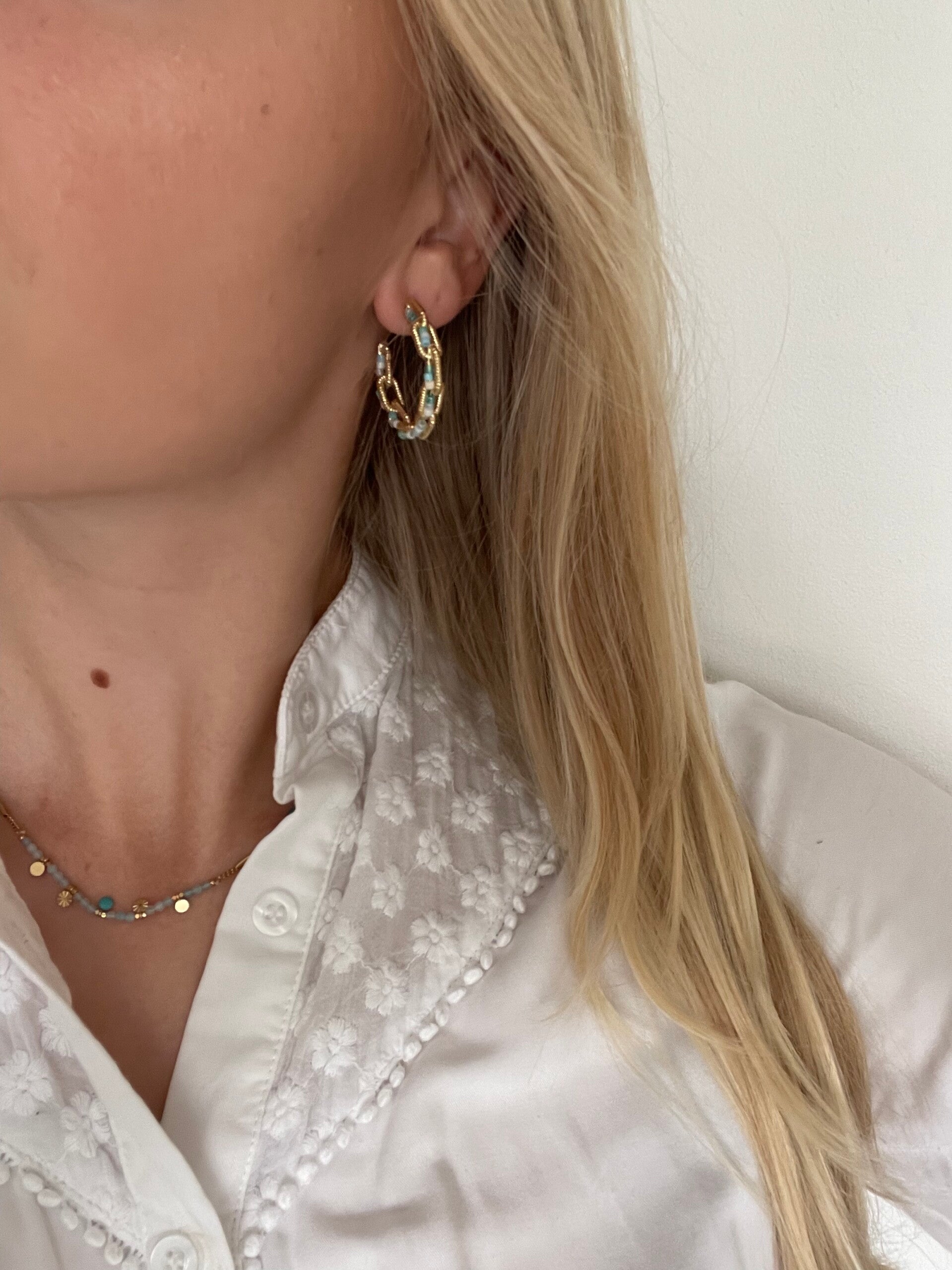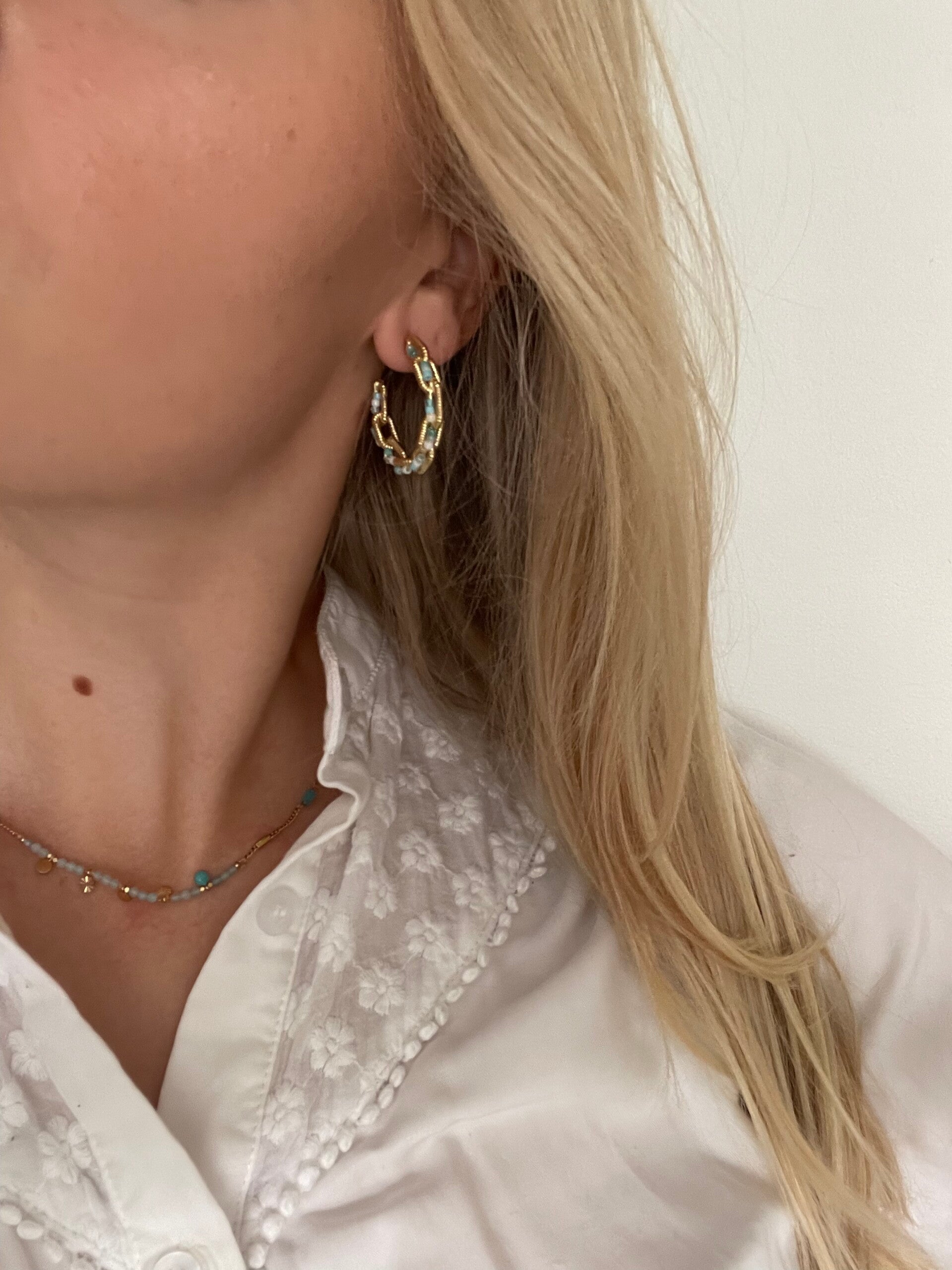 Deze gouden met tourqouise oorbellen zijn een musthave voor jouw sieradencollectie! Het straalt elegantie en luxe uit! De oorbellen zijn stainless steel.