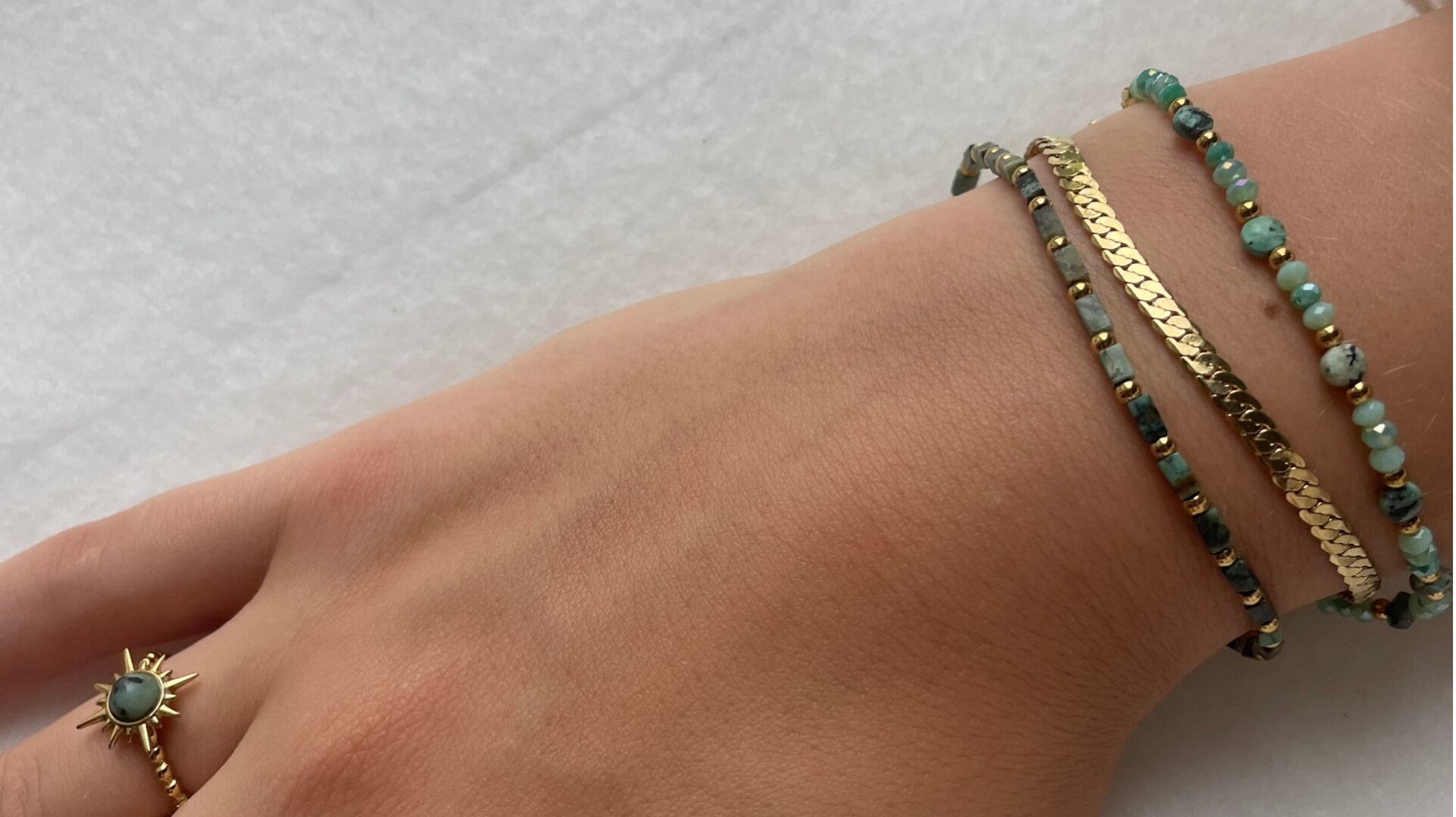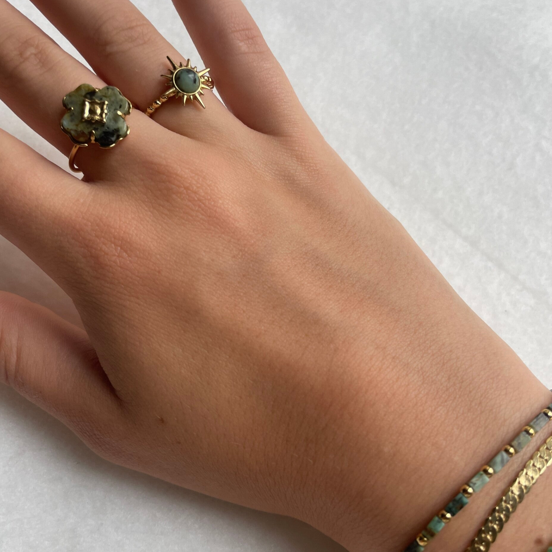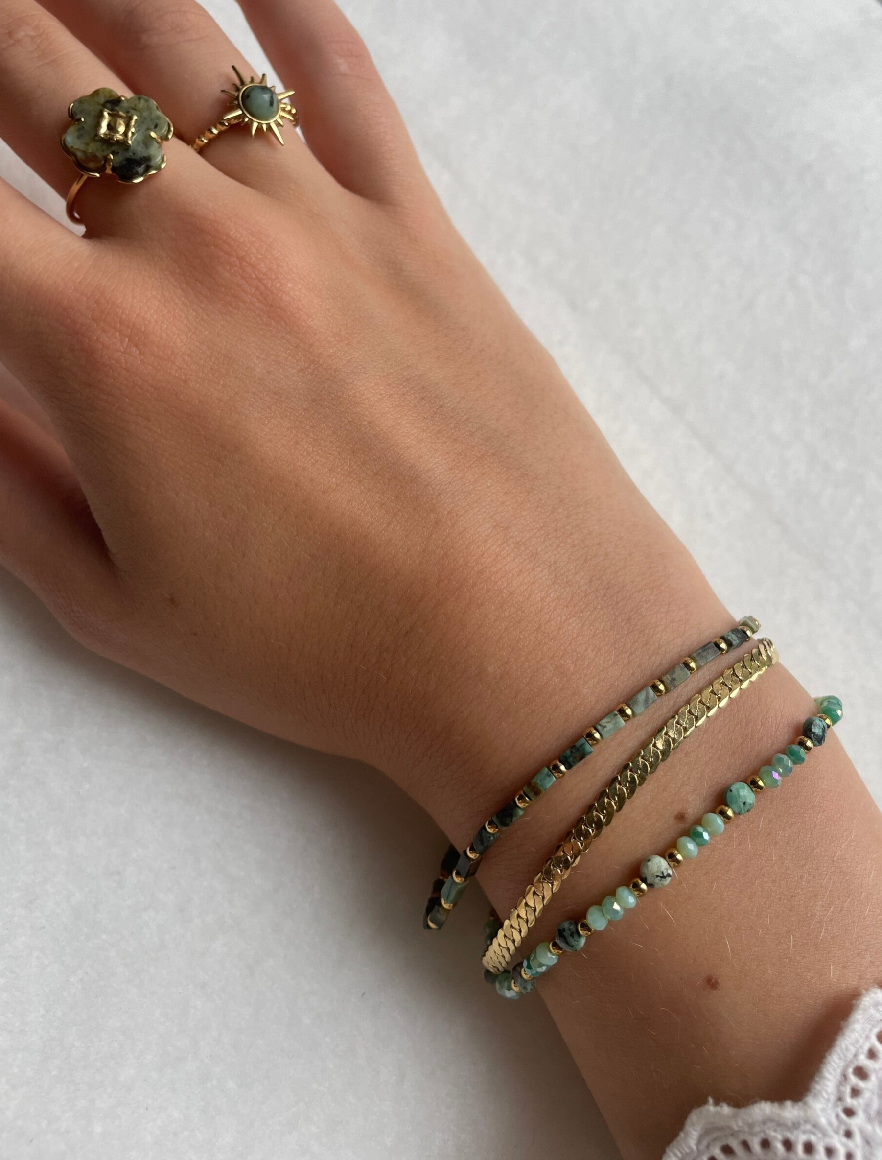 Deze gouden subtiele ring heeft een groene tint die verwerkt is in goud. Deze ring is verstelbaar en stainless steel.