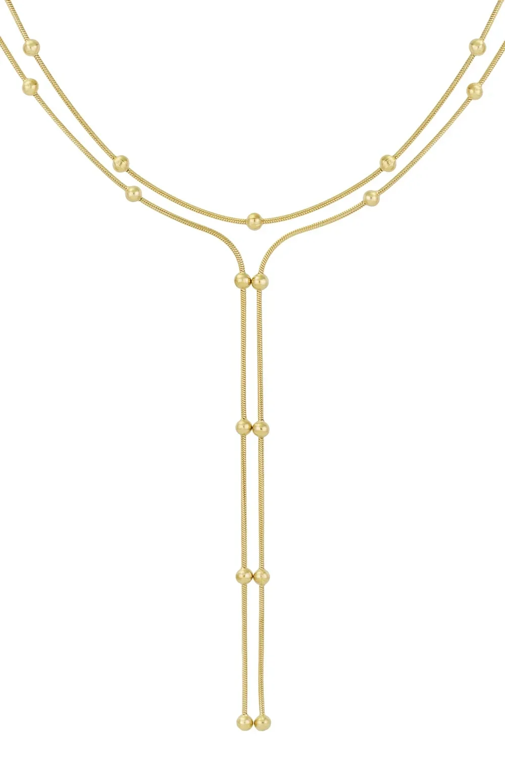 De fijne balletjes over de hele ketting geven een speels en toch chique effect, waardoor hij perfect past bij zowel een basic T‑shirt als een nette blouse.