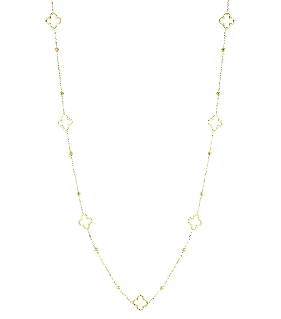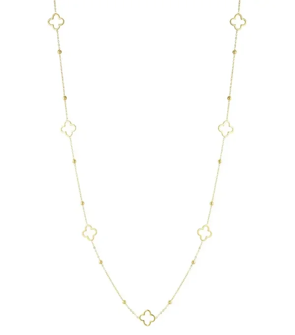 De Long Clover Charms Ketting is een elegante lange ketting met meerdere klavertje‑hangers, die je outfit een speelse en toch chique uitstraling geven.
